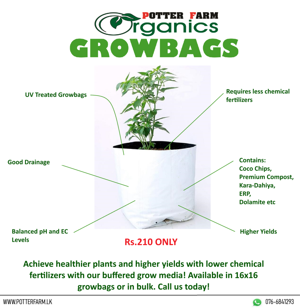 Washed unbuffered 10 cm coco-chip + quality compost + burned paddy husk in 14x14 in grow bags.